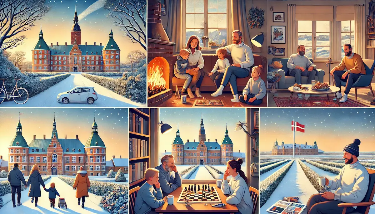 وفي داخل المنزل يشعر الشعب الدنماركي بالكثير من التفاؤل والسعادة عندما تقوم العائلة بإضاءة الشموع والجلوس لقضاء وقت ممتع في لعب الطاولة، وبالنسبة للنساء فإن المهمة الأساسية التي تجلب لهن السعادة هي الذهاب للتسوق لشراء المكونات الأساسية لتقديم أفضل أنواع الحلويات مع تناول أفضل الطعام الذي يأتي من الطبيعة.